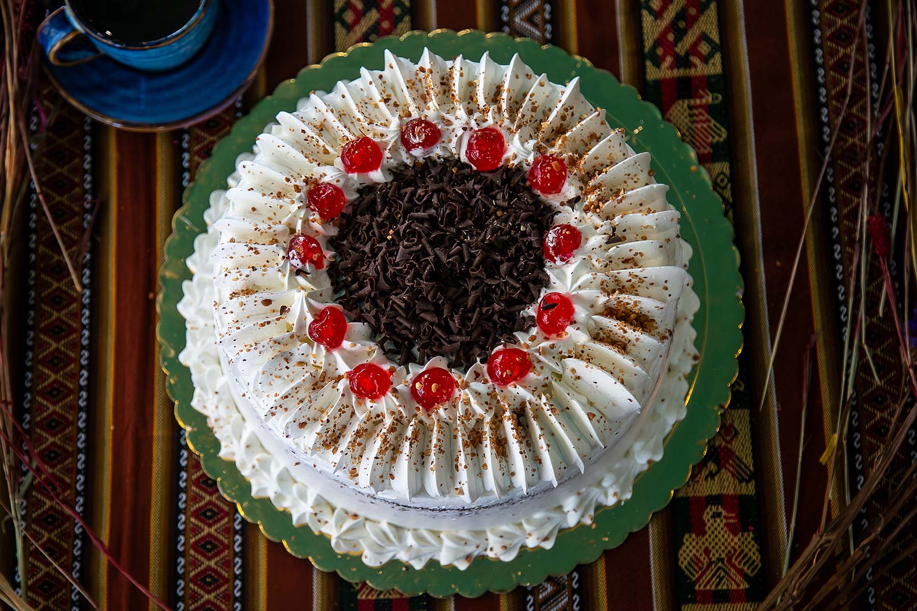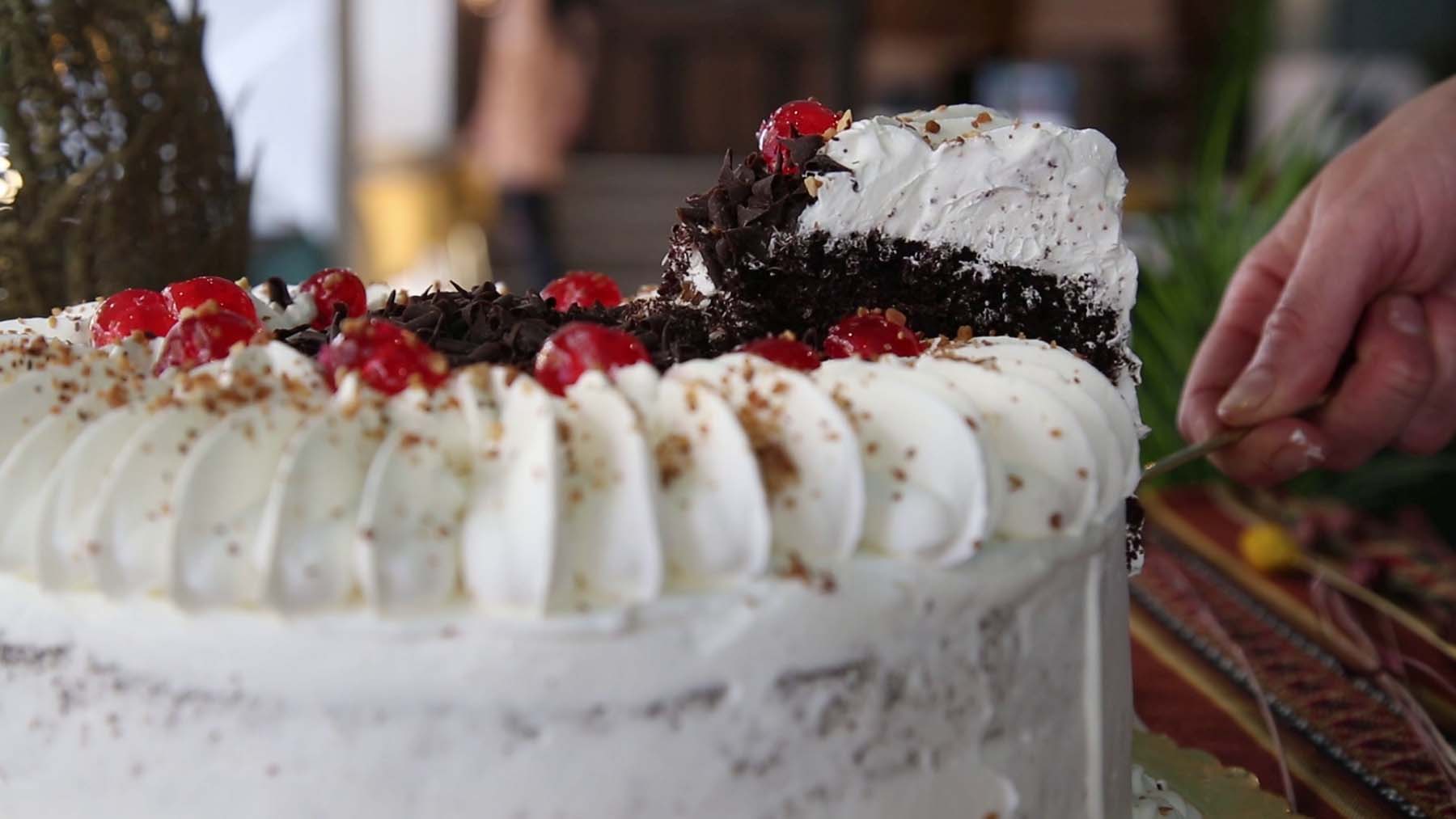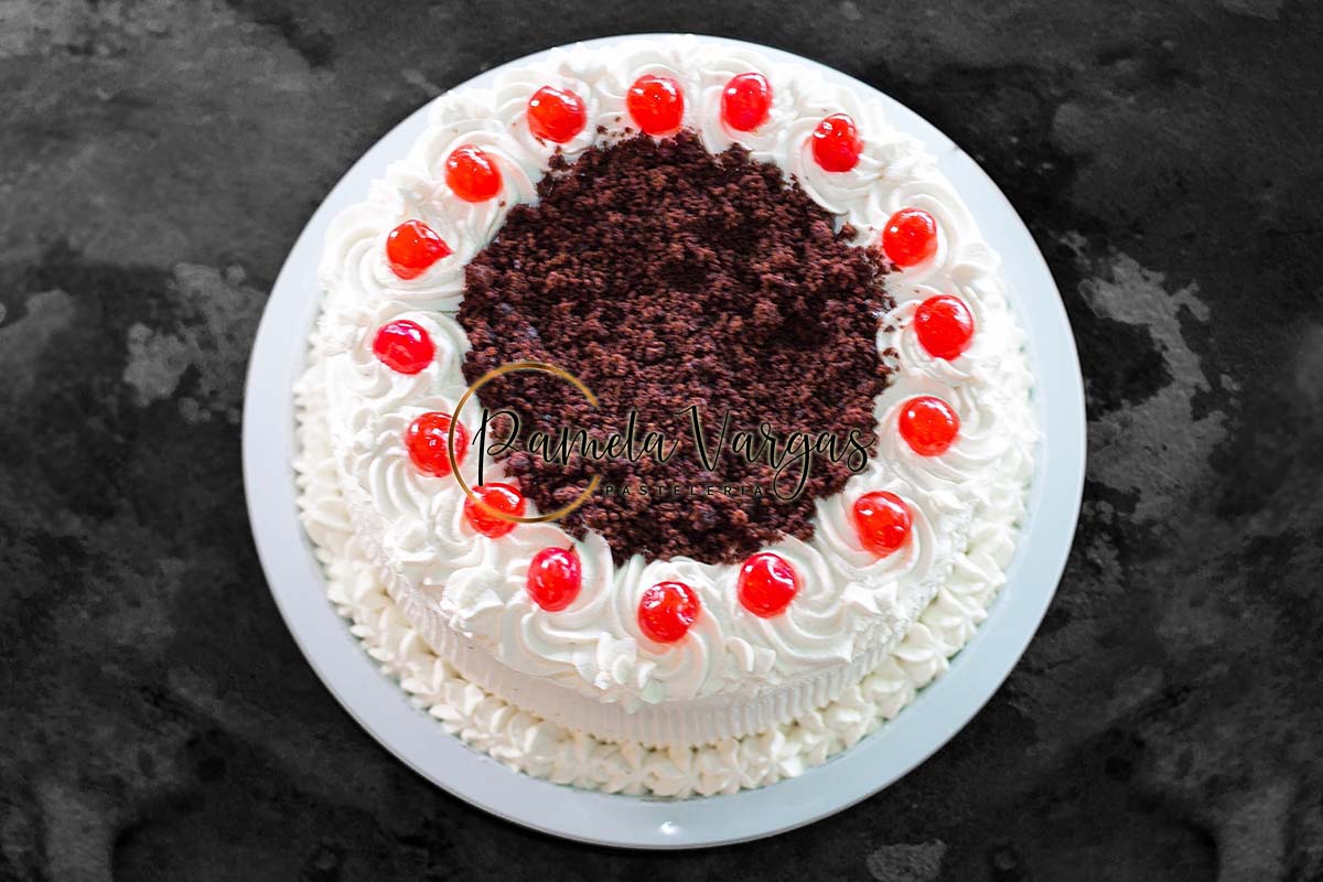 El de siempre esponjoso y húmedo bizcocho a base de cacao y chocolate; relleno de crema chantilly, trozos de cereza y un toque de mermelada de fresa. De 14 raciones